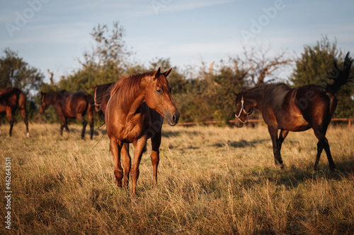 Herd of horses on autumn pasture. Animal farm. Red horse