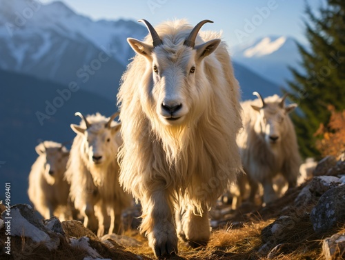 Herd of Mountain Goats on a Rocky Hill
