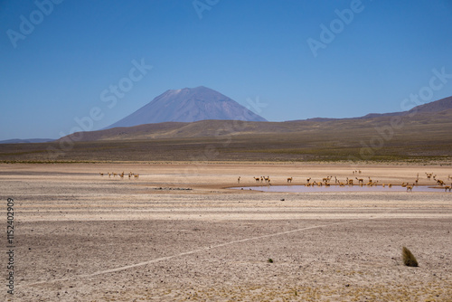 Herd of Vicuñas in Salinas Aguada Blanca National Park with Misti Volcano in Background in Peru