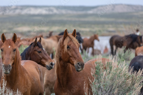 Herd of western ranch horses being rounded up and driven to summer pastures