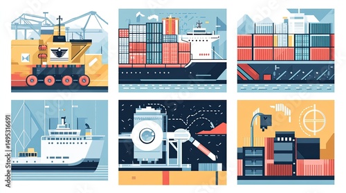 Here are six vector graphics representing global trade and logistics. They feature cargo ships, shipping containers, international routes, and custom procedures, in a clean, professional style.