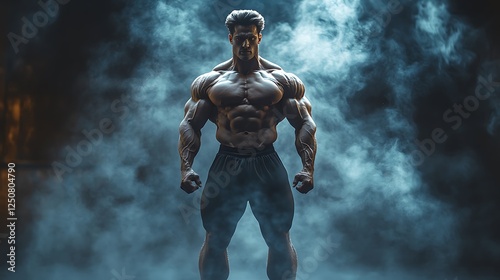 heroic, figure, standing, smoky, atmospheric, glowing, blue, light, confident, silhouette, dramatic, intense, action, mysterious, warrior, bold, powerful, fantasy, science fiction, cinematic, shadow, strength, dynamic, pose, backlighting, striking, captivating, futuristic, aesthetic, moody, foggy, heroism, strong