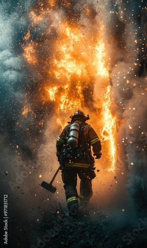 Heroic firefighter: brave fireman demonstrating courage, determination in face of danger, embodying strength, dedication required to protect lives, property during critical emergency situations