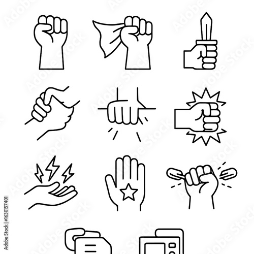 heroic, icon, grid, outline, set, hand, fist, raised, cape, fluttering, grip, weapon, handle, rescue, hold, climbing, ledge, barrier, break, power, surge, hand, symbol, mark, palm, chain, snap