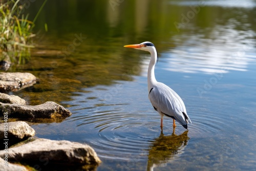 bird, heron, water, calm, shallow, standing, nature, wildlife, shore, calmness, serene, stone, habitat, aquatic, environment, scenic, calm water, summer, peaceful, elegance, feather, posture, water's edge, beak, beauty, stillness, solitude