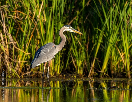 heron, bird, water bird, wading, nature, wildlife, wetland, birding, photo, outdoors, calm, still, sunlight, green, grey, aquatic, vegetation, reed, marsh, shallow, duck pond, sharpened, sharp, detailed, tranquil, beautiful, birdlife, conservation, ecology