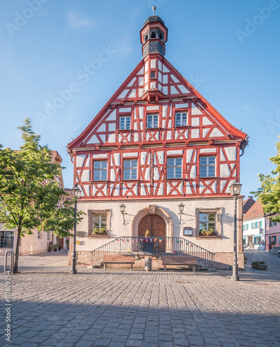 city hall, franc, historic, architecture, half-timbering, house, memorial, bavaria, inner city, mediaeval, dusk, setting sun, idylli, cobble, building, house, travel, tour tourism, tourist attraction, gain, county, entry, center, veneer, red, wooden, romantic, lamp, symmetry, frontal, home, upright format