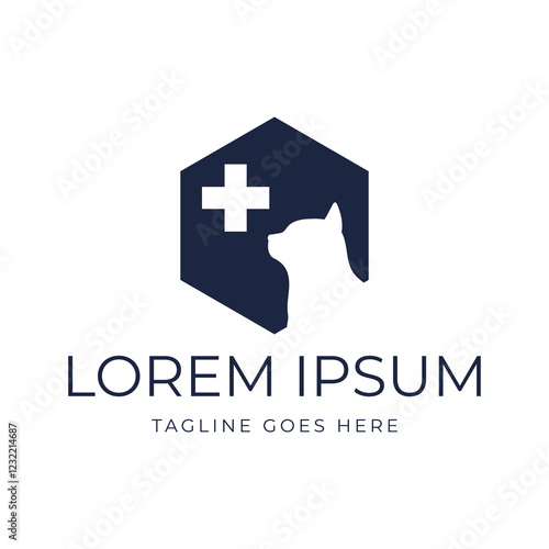 Hexagon Shield with Medical Cross Cat Kitty for Veterinarian or Pet Care Logo Illustration