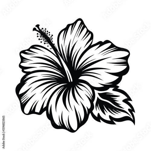 Hibiscus Flower Silhouette Detailed Blossom with Stamen and Stylized Leaves