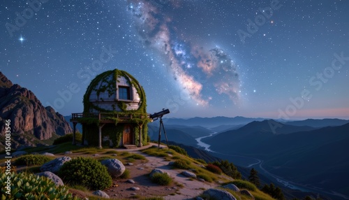 hidden, observatory, covered, vine, perched, mountain, telescope, pointed, toward, rare, star, formation, sharp, sharpened, across, entire, depth, field, blur, high, ai, generative