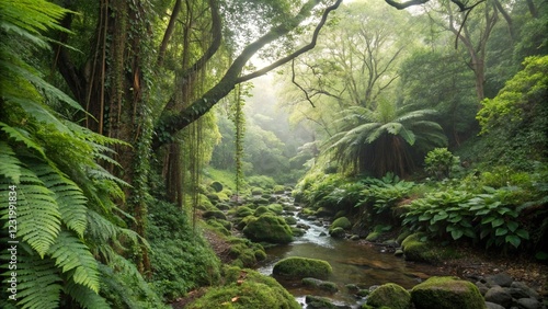 Hidden Stream in Tropical Forest with Ferns and Vines