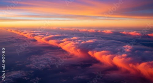 High altitude view of vast cloud formations meeting the sharp, defined horizon line, capturing the immense power of the atmosphere, cloudscape, bright, power