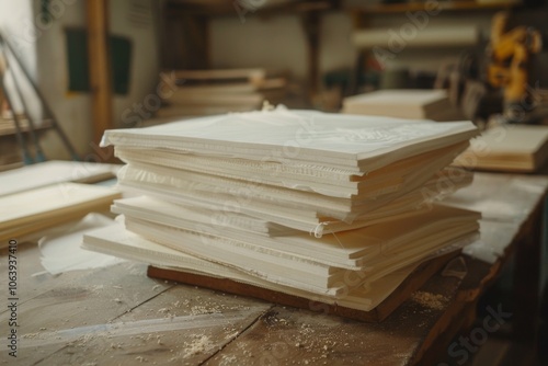 High angle shot of stack white plywood boards