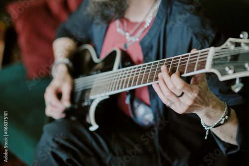 High angle view closeup of hands of unrecognizable bearded rock musician playing guitar