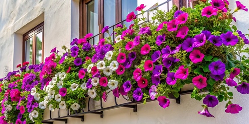 High angle view of purple and pink Convolvulus flowers on balcony with white wall