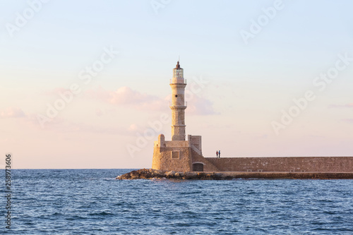 High, beautiful, ancient lighthouse made of bricks. Touristic resort Chania, Creete island, Greece. Marvelous sunset lights the sky. Along the sea shore there is a wall and the road.