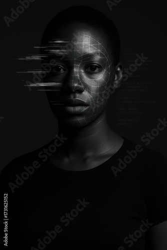 high contrast black and white portrait of a young black woman gazing at camera with glitch lines and code fragments across the face, concept of tech media, culture magazine, ai commentary
