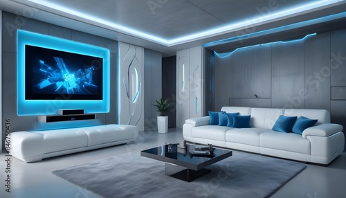 High end modern living room with white leather couch and a large flat screen tv mounted on the wall, brutalist architecture mixed with modern futuristic minimal design