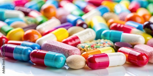 High magnification image of pharmaceutical pills and capsules on a white background, showcasing their texture and color variations, medicine, capsules