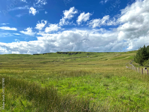 sky, landscape, grass, field, nature, meadow, summer, cloud, green, blue, cloud, agriculture, rural, hill, countryside, mountain, horizon, country, spring, farm, tree, beautiful, pasture, forest, sun