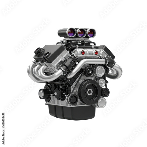 High Performance V8 Engine with Chrome Components and Mechanical Design on Transparent Background