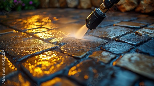 High Pressure Water Jet Cleaning Stone Pavement Golden Hour Exterior Cleaning Service Professional Cleaning Equipment Pressure Washer Cleaning Patio wet wet dark power image photo