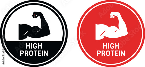 High Protein vector icon badge showing flexing arm for food label packaging design