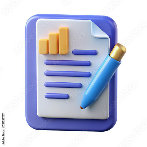 three-dimensional, render, illustration, document, report, paper, writing, pen, stylus, chart, graph, bar, datum, analysis, statistic, planning, business, finance, organisation, productivity, success, information, digital, art, icon, symbol, concept, design, creative, modern, clean