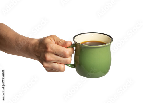 High quality PNG of hand holding a ceramic green cup of black americano coffee. Isolated image on a transparent background