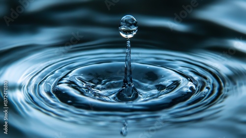 High resolution image of a clear water droplet creating concentric circular waves on a calm liquid surface