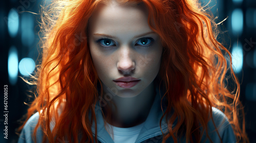 High resolution portrait of a woman with a confident and serious expression. Elegant woman in special costume in dramatic lighting. Macro portrait of a beautiful woman's face.