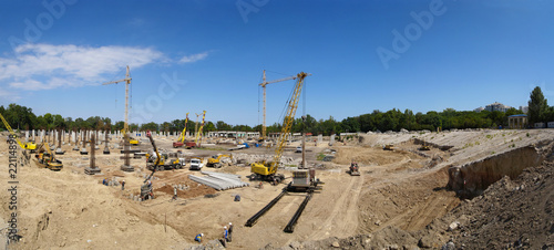 construction, construction site, hard hat, earthmover, digging, bulldozer, examining, crane, built structure, construction worker, hotel, large, real estate, concrete, building exterior, apartment