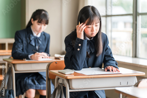 test, exam, contemplate, worry, trouble, difficult, serious, study, further education, cognition, lesson, examinee, grade, question, classroom, children, student, school, pupil, education, learning, high school, desk, woman, female, blazer, teenage, one person, young, japanese, asian, chinese, indoor, person