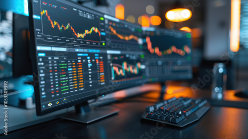 High tech workstation featuring multiple monitors displaying financial data and stock market trends, creating atmosphere of productivity and focus