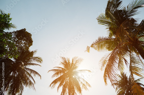 high tropical palm trees rise above beach under scorching sun against boundless blue sky sunlight