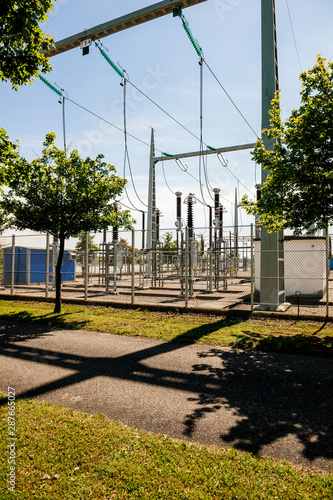 high voltage French power lines hydroelectric power plant at Centrale Hydroelectrique de Gambsheim in the background