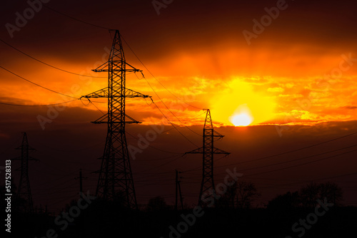 High voltage power line at sunset. Silhouettes of the metal pillars