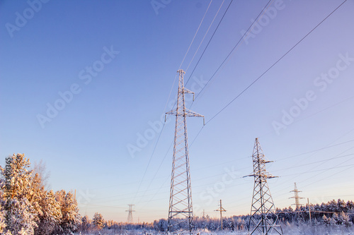 voltage, high, power, electricity, energy, line, transformer, current, winter, landscape, snow, snowy, spruce, birch, sky, technology, electrical, transmission, tower, steel, industrial, electric, cable, background, wire, white, metal, industry, danger, tall, pylon, blue, line, substation, connection