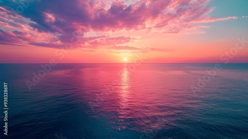 High-angle drone shot of a colorful sunset over the ocean.