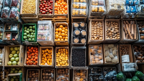 High-angle shot of a pallet filled with assorted food products, capturing the essence of supply chain management in the food industry, set in a distribution center