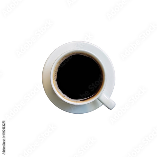 High-angle view of a full cup of black coffee in a white ceramic cup and saucer on transparent background, PNG.