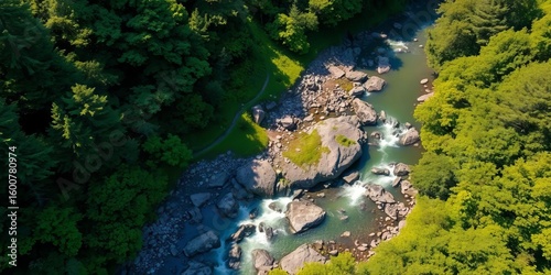 High-angle view of a rocky river snaking through a lush green forest , summer, adventure