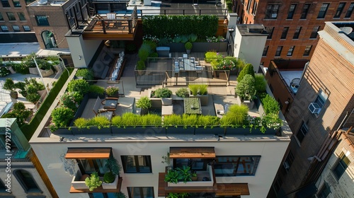 High-angle view of a rooftop garden with various potted plants and chairs, showcasing the harmonious blend of urban greenery and relaxation space in a city environment.