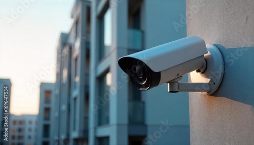 High-definition CCTV camera mounted on a building exterior, providing comprehensive security surveillance , motion detection, city