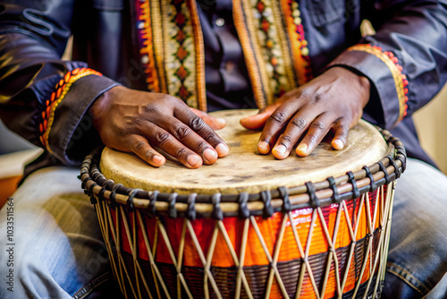High-detail photo of musician playing a traditional African drum, capturing cultural expression and the rhythm of African heritage