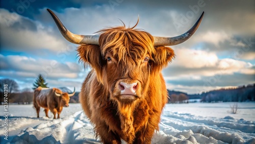 Highland Bull Winter Farm Snow Closeup Majestic Horns
