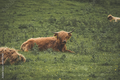 Highland cows lying in grass