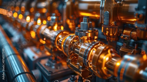 machinery, industrial, pipe, metallic, component, closeup, detailed, interconnected, engineering, manufacturing, production, warm light, bronze, technology, industry, complex, mechanical, system, equipment, metalwork, machine, factory, infrastructure, precision, gear, maintenance