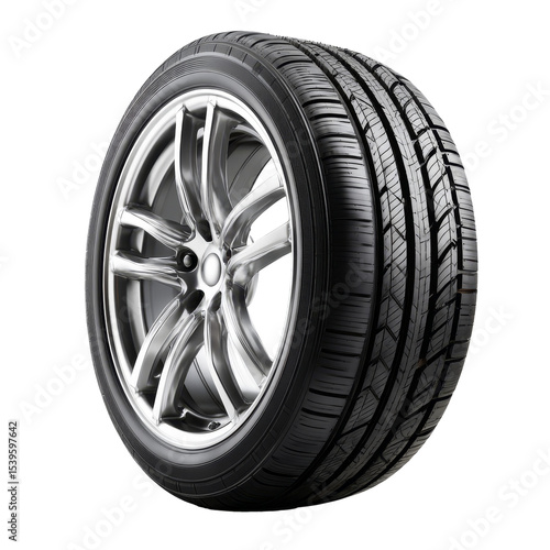 High-performance car tyre resting on a pristine white background showcasing intricate tread design and metallic rim details
