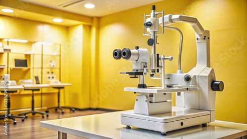 High-precision lensometer in modern optical shop with light yellow background, lensometer, modern